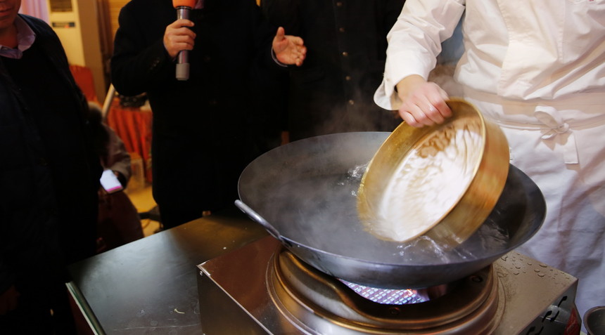 满天星的大师们还现场演示了肉丝带底制作全过程:白白的绿豆粉浆,在师傅的操作中很快就做成了一张薄如蝉翼的鲜粉皮,接着切芹菜、炒肉丝、拌粉皮,一道肉丝带底就做好了,酸、辣、香、冲,爽、柔、弹、滑,美味至极……